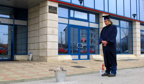 Oko deset sati došli smo pred zgradu MZOS-a. Na licu mjesta otkrila sam da je hamper vjedro iliti sić. Novinari su se okupili i počelo je paljenje. Doktorat kolegice Đurđice Čilić Škeljo nikako nije htio izgorjeti. Zezala sam je da je sigurno plastificirala stranice, iako mislim da se to dogodilo jer je tema polonistička, a Poljska je već u EU. Hrvoje je zapalio nekoliko publikacija kojima je bio urednik, a koje imaju tvrde korice pa je i njegov plamen nešto potrajao. Gorjeli su i Leonidini i Dijanini i Nevenovi radovi. Moj skromni doprinos, koji tek čeka da nekoga zaduži, nestao je u par sekundi. Nakon pola sata sagorijevanja, Sunčica Findak čučnula se ispred polugorećeg hampera i demonstrirala javljanje s prve crte. No, kako ju je napao prkosni dim iz tog istog hampera, nacija je u montaži ostala uskraćena za ovaj njezin aktivistički doprinos. Dok je još bilo prilike, predložila sam da okrenemo janjetinu na žaru od znanstvenih radova i ponudimo njome ministra Jovanovića kako bismo dokazali tržišnu isplativost naših radova. Naš prijatelj Đebo, koji je u ovoj akciji sudjelovao kao moralna potpora, rekao je da bismo u tom slučaju janetinom trebali počastiti okupljene novinare, kao što je to učinio Ante Gotovina. Nakon što je žar istinjao svoje, pojavilo se pitanje urne. Dijana je predložila da ju urudžbiramo u Nacionalnom vijeću za znanost ili MZOS-u.