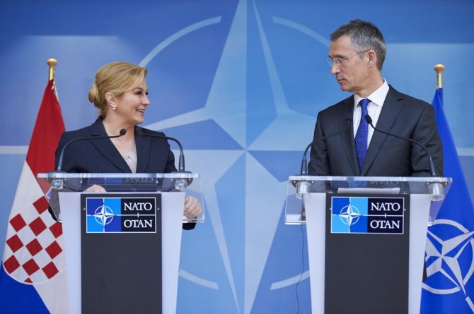 Politolog Anđelko Milardović, iako ideološki desnog srca, ne može se oteti dojmu u anketi za HTV-ov Press klub Jasmine Popović da se Kolinda Grabar-Kitarović ponaša "više kao ekspozitura NATO-a, nego kao predsjednica RH". Odijeva se u vojnu odoru NATO-kroja, mota se među vojnicima, puškama i pištoljima kao da je Bijedna Naša u ratnom stanju, a ne u teškim gospodarskim, društvenim i moralnim problemima. Neki važni elementi slagalice o tome tko je, što je i čija je zapravo hrvatska "žena iz naroda" uvelike se daju prepoznati iz retorike kojom se služi u odnosu na Ukrajinu, ali i susjednu Srbiju, gdje je Putin duboko zakoračio.