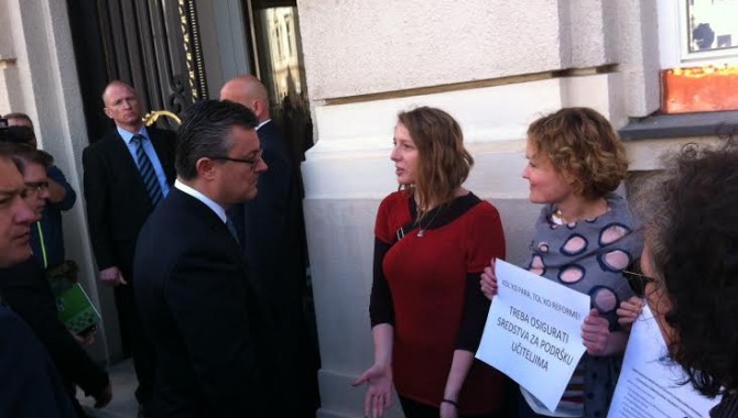 Bacate li uloženi trud i novac?, Umjesto gušenja, smrtonosna injekcija! ,Kol`ko para, tol`ko reformi!, Treba osigurati sredstva za podršku učiteljima!, pisalo je na transparentima s kojima su aktivisti dočekali zastupnike.