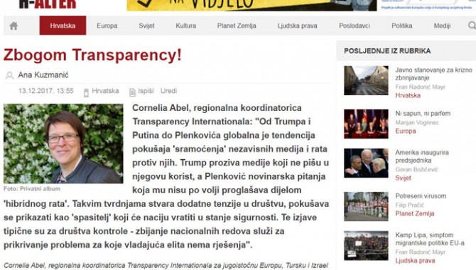 Na Vašim mrežnim stranicama 13.12.2017. godine objavljen je tekst autorice Ane Kuzmanić na hrvatskom i engleskom jeziku pod naslovom Zbogom Transparency! Članak je objavljen u sklopu projekta 'Vladavina prava' koji sufinancira Agencija za elektroničke medije (Fond za potic"Između ostalog ste vrlo rijetko u tom razdoblju objavljivali naša priopćenja ili kontaktirali naš ured za izjave"anje pluralizma i raznovrsnosti elektroničkih medija).