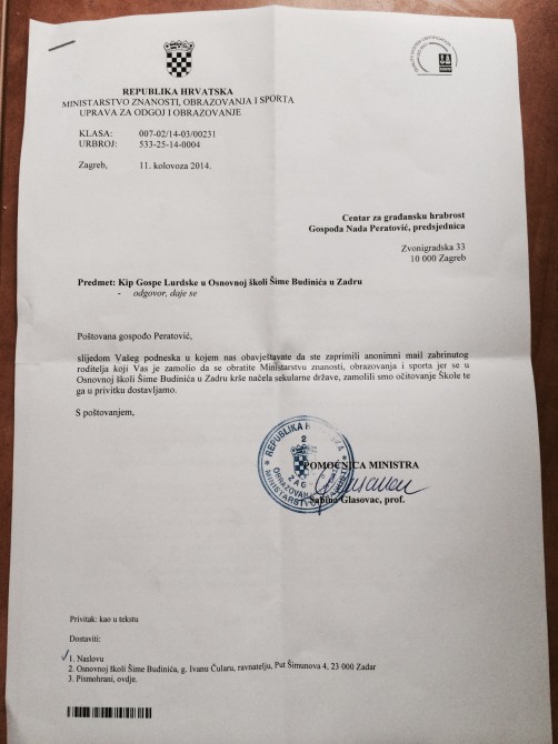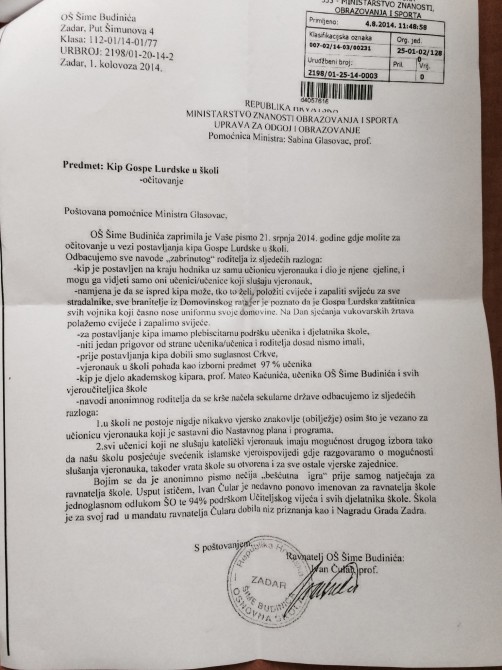 "Slijedom Vašeg podneska u kojem nas obavještavate da ste zaprimili anonimni mail zabrinutog roditelja koji Vas je zamolio da se obratite Ministarstvu znanosti, obrazovanja i sporta jer se u Osnovnoj školi Šime Budinića u Zadru krše načela sekularne države, zamolili smo očitovanje Škole", stoji u odgovoru pomoćnice ministra Mornara Sabine Glasovac Centru za građansku hrabrost, koji je podnio prijavu u ime zabrinutog roditelja.