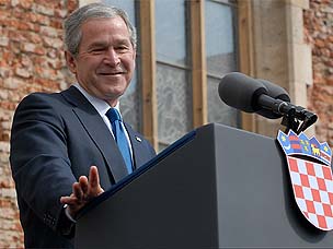 Hrvati su, naime, do svoje nacionalne slobode došli bez američke pomoći prije 17 godina. Štoviše, u vrijeme kada se Hrvatska borila za samostalnost, obitelj Bush stajala je baš na strani onih koji su taj hrvatski put osporavali. Lawrence Eagleburger, ambasador SAD u Jugoslaviji, u ime Busha starijeg blagonaklono je gledao na pokušaje ograničavanja hrvatske suverenosti. Bio je srpski lobist za tvornicu Zastava. James Baker, Bushov inoministar, amenovao je čak i vojni napad na Hrvatsku. Bush senior pokroviteljski je u to vrijeme podržavao Antu Markovića. Obitelj Bush podržavala je dakle sve, osim hrvatskih državotvoraca i osloboditelja, koji su u njihovim očima naglo od terorista prekvalificirani u borce za slobodu. Hrvatska je tada, za svoju slobodu i sigurnost, doista trebala pomoć i podršku NATO-a, ali je nije dobila. Dobili su je njeni neprijatelji. Danas, kada su stvarne ugroze daleko od hrvatskih granica, i kada država sa svojom vojskom očito može efektivno odvratiti svaki zamislivi napad (konačno: ni moćne SAD, sa svim svojim saveznicima, nemaju snage za okupaciju Iraka i Afganistana, pa tko bi onda mogao okupirati Hrvatsku!?), Bush dolazi da bi nama jamčio slobodu. Članak 5 Atlantske povelje kaže Svi za jednoga, jedan za sve. Ono svi za jednoga u slučaju Hrvatske očito je deplasirano, pa nas u toj jednadžbi može zanimati samo drugi dio - jedan za sve.