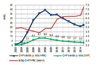 Podsjetimo, osam je banaka, uz spomenute tu su i Unicredit (Zagrebačka banka), OTP, Sberbank te Societe Generale (Splitska banka), sve u stranom vlasništvu, od 2004. do 2008. godine nudilo povoljne kredite u CHF. Tečaj franka naspram kune u tom je razdoblju pao s oko 5 na 4,4, što je doprinijelo popularnosti tih kredita. A onda počinje svjetska gospodarska kriza što, između ostalog, uzrokuje i velike nestabilnosti na financijskom tržištu, posebno po pitanju švicarske valute.