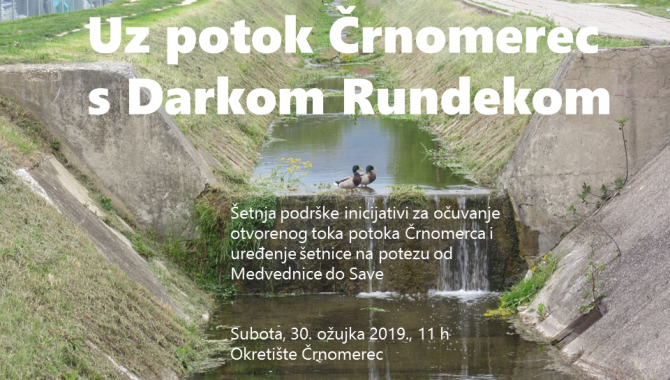 Pozivaju se Zagrepčani i Zagrepčanke i svi prijatelji Zagreba da se pridruže u šetnji trasom potoka Črnomerca s Darkom Rundekom i iz prve ruke dožive taj vrijedni, ali zapušteni prostor s ogromnim potencijalom. Vašim dolaskom podržavate nastojanja da se potok Črnomerec sačuva, a Zagreb uvede prostorno planiranje po standardima 21., a ne 20 stoljeća!