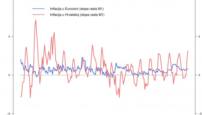 Prvo, danas problem nije inflacija, već njeno odsustvo. Nekonvencionalna monetarna politika bi se mogla isplatiti ne samo zbog koristi od nove infrastrukture već i zato jer bi povećala stopu inflacije. Naime, današnjih 0 do 1 posto je premalo, te preblizu opasne deflacije. Ukoliko se netko pita što deflacija čini privredi, neka promotri slučaj Japana koji se s deflacijom bori već nekoliko desetljeća. Nema konsenzusa oko toga koja je optimalna razina inflacije, ali obično se smatra da je svaka infacija koja je jednoznamenkasta prihvatljiva. Današnja je inflacija manja čak i od 2 posto kojih se držao konzervativni Bundesbank. Dakle, i Europska središnja banka i Hrvatska narodna banka premašile su cilj. U Hrvatskoj smo prvi dio 2016. godine proveli u deflaciji, a na godišnjoj bazi će se stopa inflacije vjerojatno kretati malo ispod nule. I tako je već duže vrijeme, kao što prikazuju grafovi. Prvi prikazuje godišnje stope rasta potrošačkih cijena, a drugi mjesečne stope rasta u novčanoj masi. Stope inflacije u Hrvatskoj su harmonizirane s onima u Eurozoni, što nije neobično s obzirom da je kuna manje-više vezana za euro. Na mjesečnoj bazi postoje određene hrvatske specifičnosti, vezane uglavnom uz ljetne mjesece kada turizam malo ubrza ekonomsku aktivnost i inflaciju. Slično važi i za prosinac i pojačanu božićnu potrošnju.
