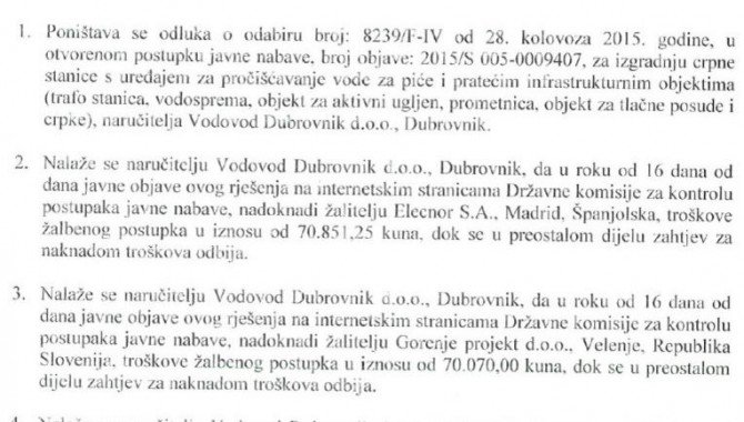 Napominju i kako su proučili Rješenje Državne komisije iz kojeg je sasvim jasno da je odluka Vodovoda Dubrovnik o izboru najboljeg ponuditelje poništena na osnovu žalbe četiriju preostalih sudionika natječaja, čije je ponude Vodovod proglasio nevaljalima. U njemu jasno piše da je odluka poništena zbog čak 11 osnova iz žalbi, što nikako ne odgovara navodima iz priopćenja Vodovoda kako je "značajan dio žalbenih razloga odbačen kao neosnovan, a jedan dio prihvaćen".
