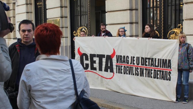 Aktivisti i aktivistkinje Zelene akcije danas su pred Hrvatskim saborom organizirali akciju povodom posjete Cecilie Malmström, povjerenice Europske komisije za trgovinu, čija je namjera, između ostalog, da hrvatske političare_ke i javnost uvjeri da CETA, Sveobuhvatni gospodarski i trgovinski sporazum između EU-a i Kanade, predstavlja "najnapredniji sporazum te vrste u povijesti i da treba poslužiti kao model za trgovinsku politiku Europske unije u 21. stoljeću". Priopćenje Zelene akcije prenosimo u cijelosti: