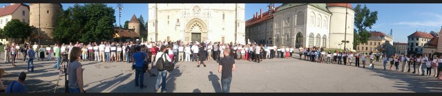 U pauzama od molitvi, u pozadini su odjekivali stihovi vjerskih pjesama i budnica Marka Perkovića Thompsona, koje je u glas pjevala skupina hrvatskih muževa u četrdesetim godinama te njihove starije istomišljenice. Obružani uokvirenom slikom Isusa, velikim drvenim križem, krunicama i natpisima ubijenih hrvatskih žrtava, zazivali su "komuniste, titoiste i mesićevce". Među svima njima izvirivao je i transparent "Apage Satanas!".