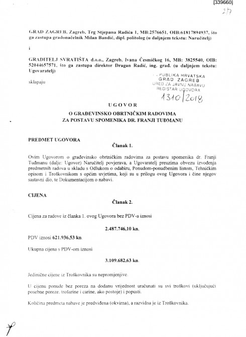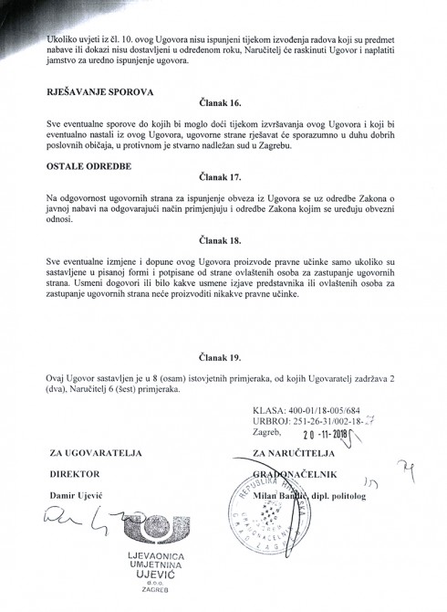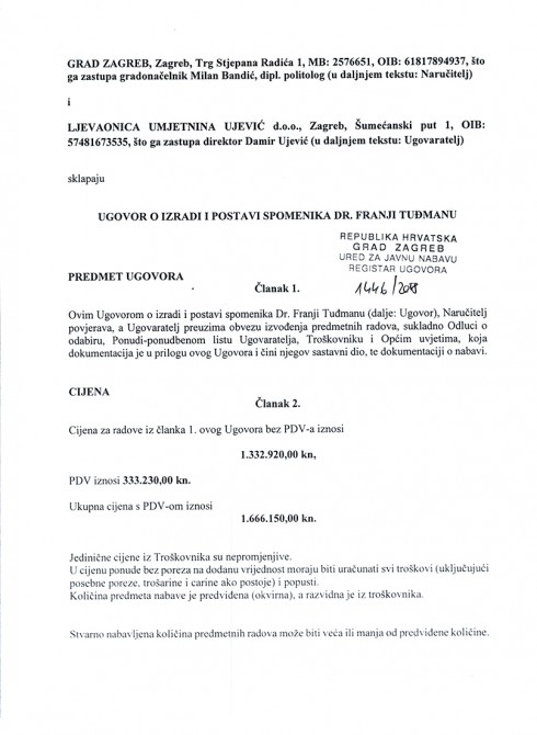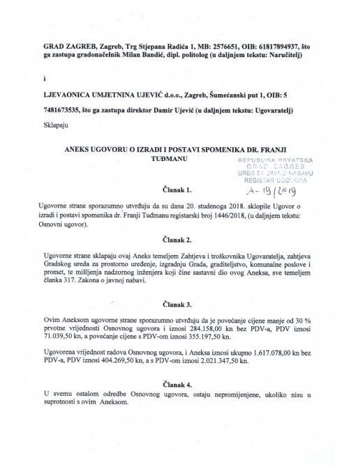 S Ljevaonicom umjetnina Ujević d.o.o. vlasnika Damira Ujevića potpisan je osnovni ugovor na iznos od 1.666.150,00 kn kojeg su ponudili u postupku javne nabave. Njihova je ponuda bila tek za oko 1.000,00 kn niža od ponude drugog ponuđača, Ljevaonice umjetnina ALU d.o.o., dok su u svim ostalim kriterijima ponude bile identične. Naknadno je cijena povećana za 355.197,50 kn i sveukupno iznosi 2.021.347,50 kuna, navodi se u aneksu ugovora.