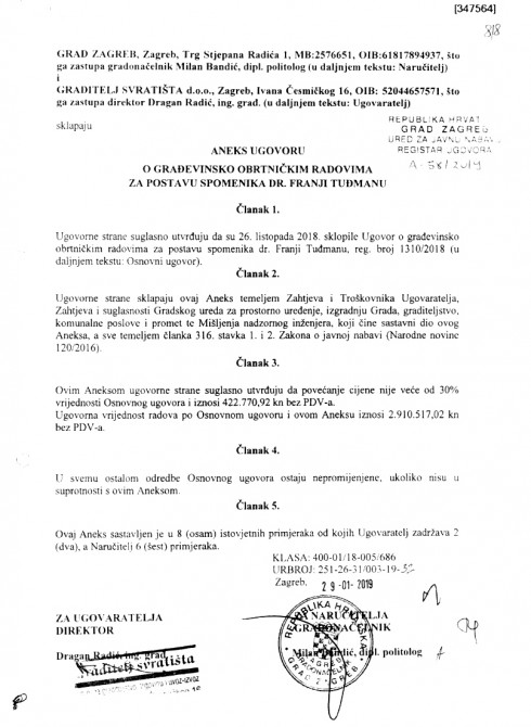 Zakon naime dopušta izmjenu ugovora o javnoj nabavi bez provođenja novog postupka nabave ukoliko povećanje cijene nije veće od 30% vrijednosti osnovnog ugovora. Ova zanimljiva zakonska mogućnost otvara puno prostora za kreativne igre s javnom nabavom koje bi se moglo zasebno analizirati, ali to je posao kojim bi se trebale i morale pozabaviti institucije, primjerice državna revizijaNajnoviji dokumenti zapravo su aneksi ranije potpisanim ugovorima. Radi se o dva ugovora, onom za izradu kipa koji je potpisan s Ljevaonicom umjetnina Ujević d.o.o., te o ugovoru s tvrtkom Graditelj svratišta d.o.o. za izvedbu građevinsko obrtničkih radova za postavu spomenika. U oba slučaja prvobitno ugovoreni iznos je povećan, a sam aneks sklopljen na temelju članka 316. Zakona o javnoj nabavi. Zakon naime dopušta izmjenu ugovora o javnoj nabavi bez provođenja novog postupka nabave ukoliko povećanje cijene nije veće od 30% vrijednosti osnovnog ugovora. Ova zanimljiva zakonska mogućnost otvara puno prostora za kreativne igre s javnom nabavom koje bi se moglo zasebno analizirati, ali to je posao kojim bi se trebale i morale pozabaviti institucije, primjerice državna revizija.