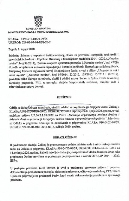 Dana 2. prosinca 2019. Sunce zaprima obavijest Ministarstva, datiranu s 27. studenoga, o odbijanju projektnog prijedloga zbog administrativnih Čitav postupak ilustrira kraljevsko samoobdarivanje birokracije ekstremno dugačkim rokovima, dok za prijavitelje na natječaj odrezuje ultrakratke – šest mjeseci naspram šest danarazloga: bez traženja ikakvih dodatnih objašnjenja natječajni prijedlog je odbijen, jer nisu bili priloženi - da utvrdimo gradivo - financijski izvještaji ili izjave o financijskoj nekativnosti projektnog partnera.