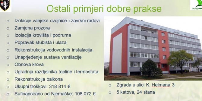 Individualizacija potrošnje toplinske energije je samo preduvjet za ozbiljnije uštede energije, koje se ostvaruju zahvatima na termo tehničkim sustavima te na obnovi vanjske ovojnice same zgrade. Ovaj postupak je izuzetno težak i dugotrajan, ali ujedno i jedini koji vodi stvarnom smanjenju troškova i ugodnijem stanovanju. Kako priča ne bi bila toliko crna, možemo izdvojiti jedan uspješan primjer postupne tranzicije tri zgrade obuhvaćene zatvorenim toplinskim sustavu, u naselju Švarča u Karlovcu. Kao energent se donedavno koristilo loživo ulje, nakon čega je napravljena prvo tranzicija na prirodni plin. Nakon toga uslijedila je ugradnja razdjelnika topline, prije početka prošlogodišnje sezone grijanja, dok se tokom ovog ljeta krenulo u potpunu obnovu vanjske ovojnice zgrade, koja je ujedno obuhvaćala i ugradnju izolacije. Kroz ovu tranziciju obuhvaćen je bio 131 stan dok je ukupna investicija, sufinancirana sredstvima Fonda za zaštitu okoliša i energetsku učinkovitost, iznosila 4,2 milijuna kuna. Prema projektnoj dokumentaciji, s fasadom od 14 centimetara stiropora i sa izmjenom stolarije ušteda bi trebala biti do 60 posto.
