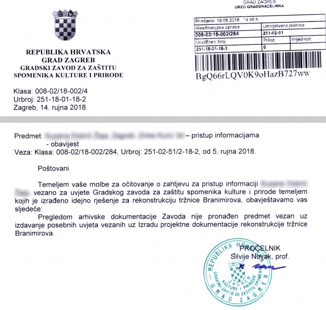 Također su u obrazloženju naveli da je idejni projekt obvezujući i da je izrađen u suradnji s Gradskim zavodom za zaštitu spomenika kulture i prirode, međutim u Zavodu tvrde da "nije pronađen predmet vezan uz izdavanje posebnih uvjeta vezanih uz Izradu projektne dokumentacije rekonstrukcije tržnice Branimirova."