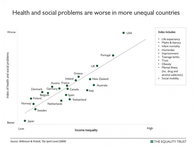 Kako točno ekonomski sustav utječe na obrazovni vrlo je zanimljivo pitanje, a dio odgovora se sigurno može pronaći u knjizi The Spirit Level Richarda Wilkinsona i Kate Pickett koja jasno pokazuje način na koji ekonomska nejednakost utječe na niz društvenih patologija poput ubojstava, inkarceracije, mentalnih bolesti, korištenja droge i nepovjerenja među ljudima. U principu, što je društvo nejednakije to su sve njegove patologije izraženije.