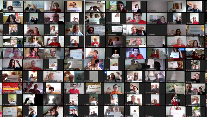 E-prosvjed održan je 1. svibnja od 11:00 do 12:00 pod sloganom "Radnicima hvala – ali prvo prava“, a okupio je stotinjak prosvjednika, koliko je dopuštala platforma Zoom te tisuće prosvjednika koji su pratili i podržavali prosvjed putem Facebook stranice SSSH. Priopćenje prenosimo u cijelosti: