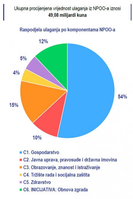 Ukupna procijenjena vrijednost ulaganja na osnovu plana oporavka iznosi 49,08 milijardi kuna (oko 6,544 milijardi €), a raspodjela ulaganja predviđena je na sljedeći način: