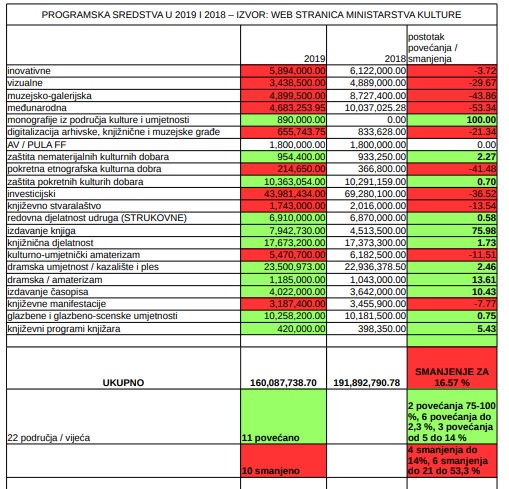 Inicijativa je danas objavila usporedbu dodjele programskih sredstava Ministarstva kulture po područjima u 2018. i 2019. godine, a koja pokazuje kako je bilanca negativna čak i uz povećanje za izdavaštvo i nakladništvo.