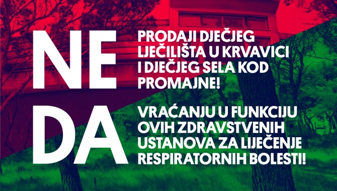 Tri udruge iz Zagreba/ Trogira, Podgore i Splita u ponedjeljak su započele kampanju prikupljanja potpisa koje će priložiti pismu upućenom Vladi RH te resornim ministarstvima kako bi upozorile na pogrešnu Vladinu politiku rasprodaje državne imovine - nekadašnje zdravstvene infrastrukture. Riječ je o Dječjem selu kod Promajne koje je već oglašeno za prodaju te Dječjem lječilištu u Krvavici, kod Makarske, inače zaštićenom kulturnom dobru, remek-djelu modernističke arhitekture s početka 1960-ih, zgrade poznate u svjetskim okvirima.