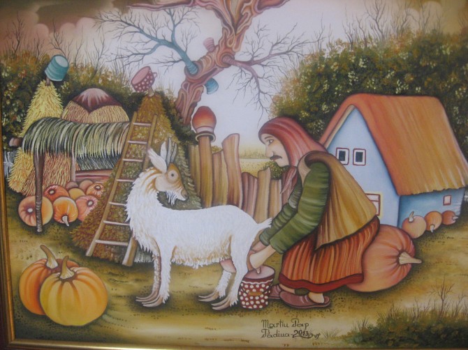 "Ovdje je naslikan muškarac koji muze kozu. Žena je otišla liječiti reumu, zadavši mu da se pobrine za kozu, inače se osuši mlijeko i čeka narednih godinu dana. Koza je bila neposlušna pa su mu susjedi rekli da će pomoći ako se obuče u ženine suknje, što je i učinio. Tri se generacije već šale na račun njegove naivnosti i govore mu da je papučar koji sluša ženu", uvodi nas u dio prošlosti sačuvane na slikarskom platnu. Više ni Kovačica nije onakva kakva je bila na slikama prvih slikara, sudeći po radu jednog slikara, vidljivo je da je tražio osobine nekadašnjih žena u mlađima. Oni su se često bavili onim što ih je tištilo, tumači Babka.