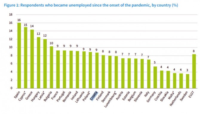 Eurofoundovo istraživanje pokazalo je da je od početka pandemije 8 posto radnika u EU-u prešlo u status nezaposlenosti. Stanje je još gore kada su u pitanju samozaposleni radnici, kojima rizik od nezaposlenosti iznosi 13 posto. Ispitanici u najmlađoj dobnoj skupini (od 18 do 34 godine), kao i slabije obrazovani, također su izuzetno izloženi riziku od nezaposlenosti.
