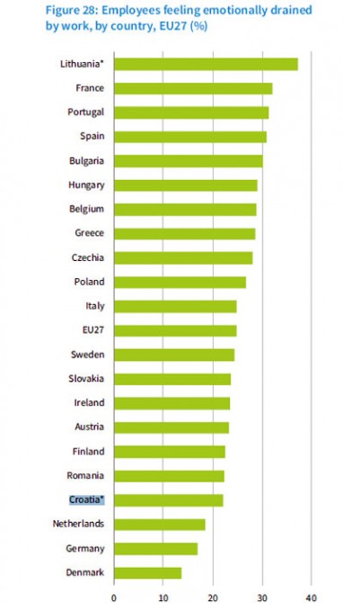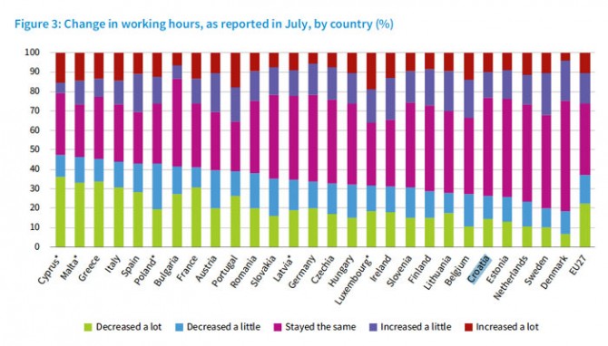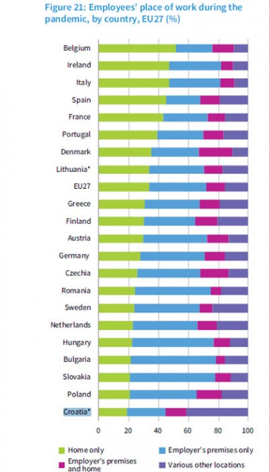 U Hrvatskoj se, do srpnja, manje nego u svim ostalim zemljama Unije prelazilo na rad isključivo od kuće. Međutim daleko najviše naših ispitanika odabralo je opciju "različita druga mjesta", tako da je postotak onih koji su ostali raditi "isključivo u prostorijama poslodavca" relativno mali. 46 posto hrvatskih građana u srpnju je izjavilo kako očekuju da će im se financijsko stanje pogoršati, i po izraženom pesimizmu bili smo zauzeli hvalevrijedno prvo mjestoAnaliza, nažalost, nije razradila pojam "različita druga mjesta", tako da nam je ova hrvatska specifičnost u istraživanju ostala nerazjašnjena. U svakom slučaju, naši se radnici ne tuže previše da su, s prelaskom na rad na daljinu dodatno opterećeni ili emocionalno iscrpljeni, što u većini EU-zemalja jest slučaj. Također, hrvatski radnici koji bi na poslu trebali biti opskrbljeni nekom vrstom opreme za osobnu zaštitu (Personal Protective Equipment), tu opremu u samo 64 posto slučajeva redovito dobiju od poslodavca, pri čemu smo također u donjem dijelu tabele EU-zemalja.