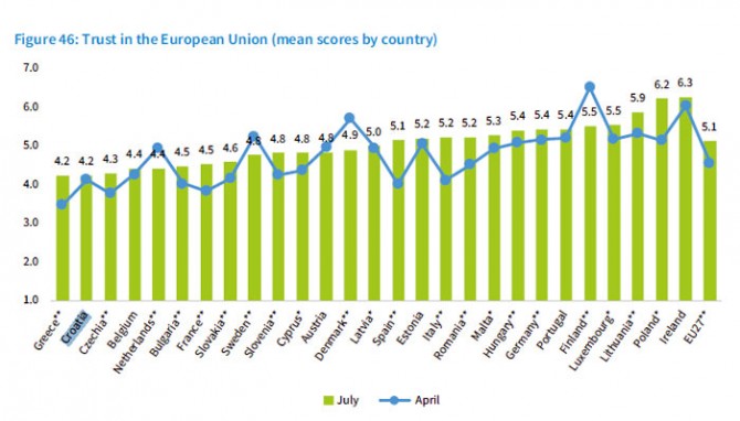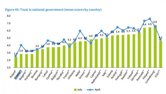 Pitanje povjerenja u institucije, osjećaja zajedništva i optimizma koji bi iz toga trebao proizaći posebna je tema. U pogledu povjerenja u nacionalne vlasti Hrvatska je, napominjemo, u srpnju, bila na predposljednjem mjestu, samo ispred Poljske. Kao što znamo, tek nakon ljeta Plenkovićeva je vlada sa svojim paradržavnim/parastranačkim nacionalnim stožerom civilne zaštite doživjela debakl u borbi s virusom i totalni gubitak kredibiliteta, pa će bit zanimljivo pratiti kako će se ta činjenica odraziti u budućem Eurofundovu istraživanju. Povjerenje naših sugrađana u institucije Evropske unije jednako je tako nisko, pa i na toj ljestvici zauzimamo pretposljednje mjesto, ovoga puta iza Grčke, čiji stanovnici, priznajmo, imaju dobre razlike da Uniji ne vjeruju. Hrvatski su građani i građanke tako ušančeni u negativnom stavu prema svim institucijama, bilo nacionalnim, bilo nadnacionalnim; dijametralno suprotan je slučaj Poljske, čiji stanovnici najmanje vjeruju svojim vlastima, ali su u samom vrhu, odmah iza Irske, kada je u pitanju povjerenje u EU. Izrazito veće povjerenje u EU u odnosu na vlastitu državu iskazale su i Mađarice i Mađari, kao i Rumunjke i Rumunji. Obrnut slučaj, znatno većeg povjerenja građana u nacionalne vlasti no u EU najnaglašeniji je u Danskoj.