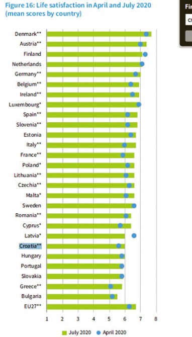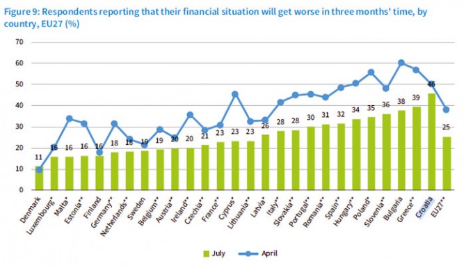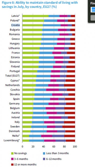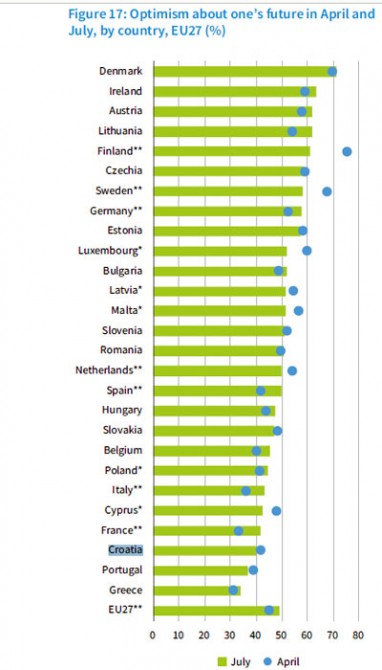 U usporedbi s drugim državama, Hrvatska u borbi s ekonomskim i socijalnim posljedicama pandemije stoji dosta loše. Devet posto ispitanika iz naše zemlje izjavilo je da je od početka pandemije ostalo bez posla – napominjemo, istraživanje je bilo provođeno u srpnju, a prvi nalet COVID-a Hrvatsku je, zahvaljujući pametnijim epidemiološkim mjerama, samo "štrajfao"; EU prosjek, rekosmo, iznosi osam posto. Hrvatska ujedno spada među zemlje u kojima je u manjoj mjeri došlo do skraćivanja radnog vremena. Nešto preko deset posto naših radnika izrazilo je bojazan od gubitka posla u naredna tri mjeseca, dok je EU-prosjek bio nešto niži. Većina hrvatskih građana ne raspolaže nikakvim uštedama kojima bi mogli prebroditi eventualne socijalne potrese poput gubitka posla, ili im te uštede ne zadovoljavaju tromjesečne potrebe, i u tom su pogledu, uz stanovnike Latvije i Poljske, u najtežoj poziciji u odnosu na sve stanovnike EU-a. Situacija se pokazala još gorom kada se odgovaralo na pitanje o očekivanjima u narednom tromjesečnom razdoblju: 46 posto hrvatskih građana u srpnju je izjavilo kako očekuju da će im se financijsko stanje U pogledu izraženog optimizma u odnosu na nastupajuće dane nalazimo se pri samom dnu, iznad Portugala i Grčke