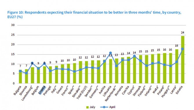 pogoršati, i po izraženom pesimizmu smo bili zauzeli hvalevrijedno prvo mjesto: EU prosjek iznosi 25 posto. Ipak, devet posto naših sugrađana izrazilo je očekivanje da će im se u tromjesečnom razdoblju (koje je završilo s 31. listopada) financijska situacija popraviti, pri čemu smo na začelju po raširenosti osobnog financijskog optimizma., u društvu s Bugarskom, Slovenijom, Luksemburgom i Belgijom. Usput rečeno, evropski prvak po pitanju osobnog financijskog optimizma je Estonija, čijih 24 posto građana je izjavilo kako kratkoročno očekuje bolje dane; mogli bismo posumnjati jesu li najbolje razumjeli pitanje.